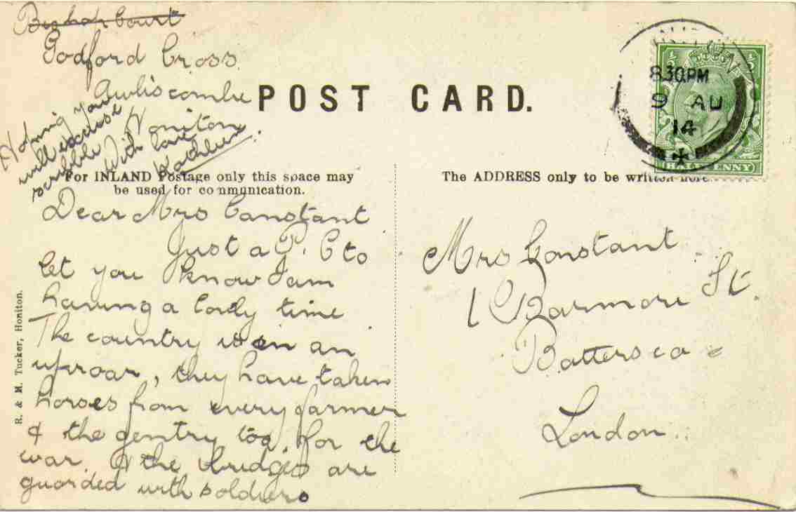 This is a postcard sent to my great-grandmother, Elizabeth Ann Constant, by a friend just days after the outbreak of the Great War.